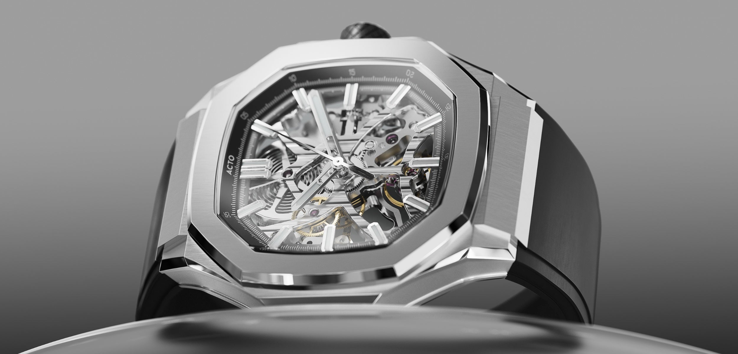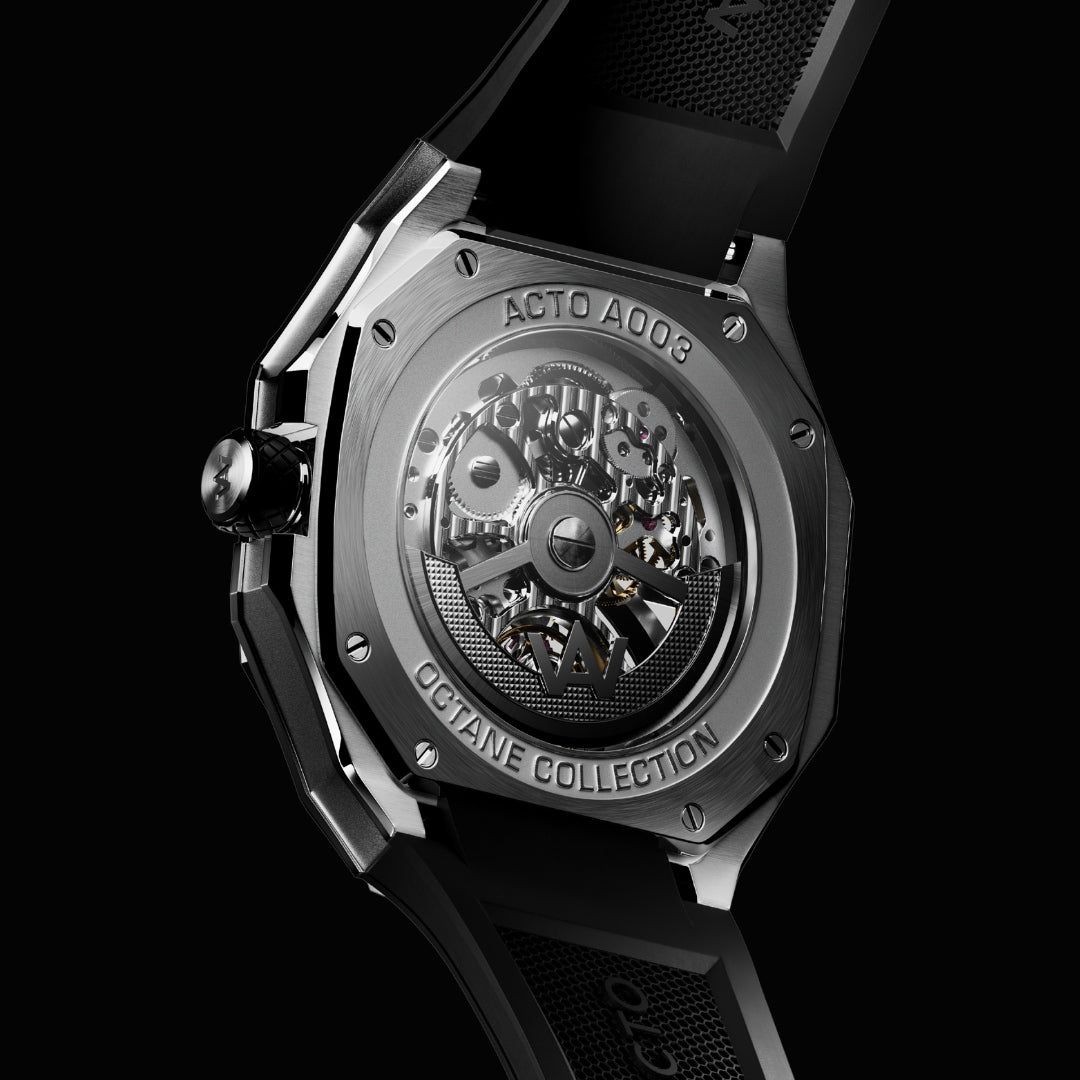 Inspirado na fundação da marca, ele apresenta uma nova leitura do formato octogonal esqueletonizado, reunindo proporções refinadas, movimento exposto e construção em aço inoxidável 316L.