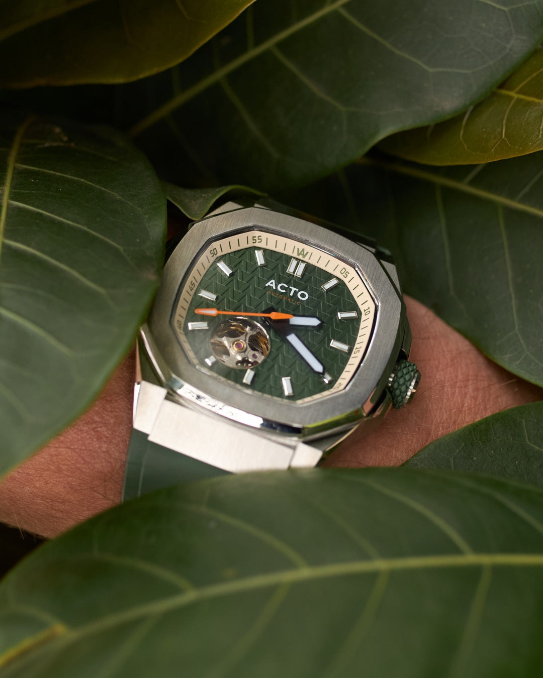 O AC01 Outlander não é apenas um relógio: é uma declaração de caráter para aqueles que têm uma conexão especial com a natureza. Seu tom verde remete à grandiosidade das florestas e montanhas inexploradas, refletindo um espírito aventureiro.